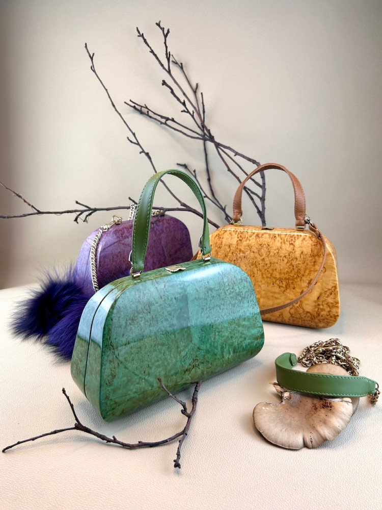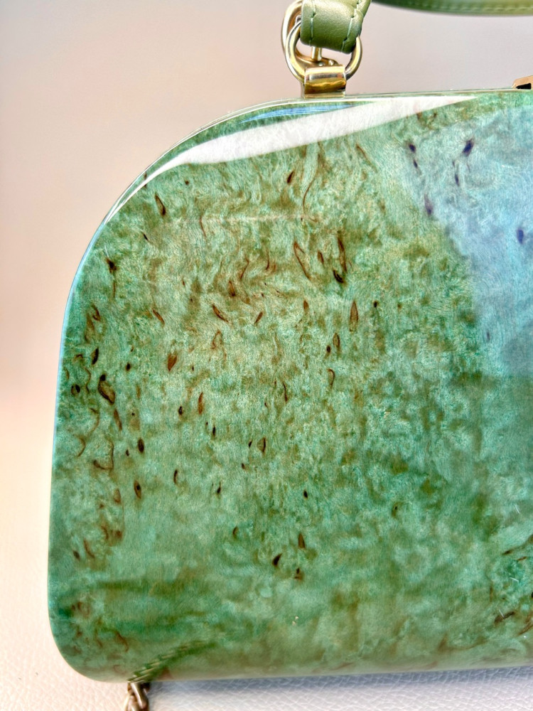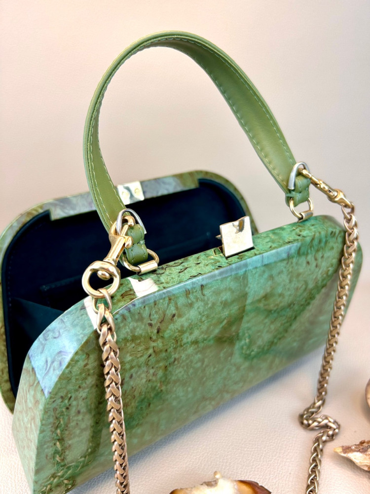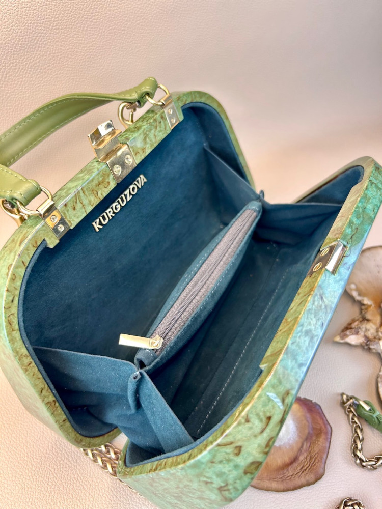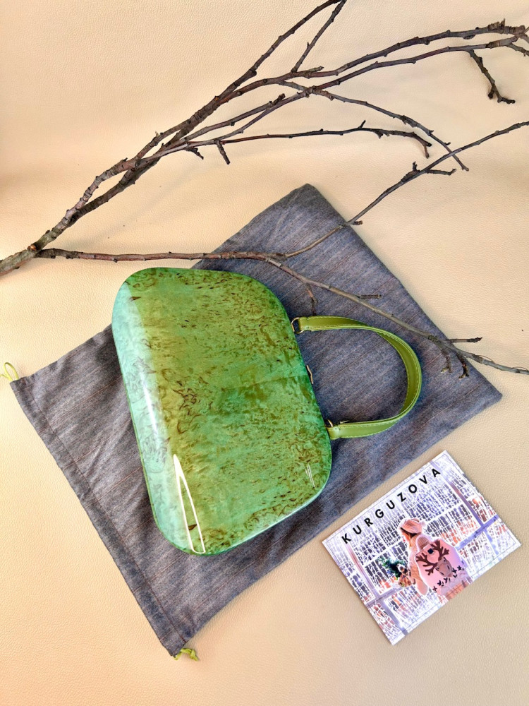 Материал сумки: натуральная карельская береза, тонированная в зеленоватый теплый оттенок, лакированная.