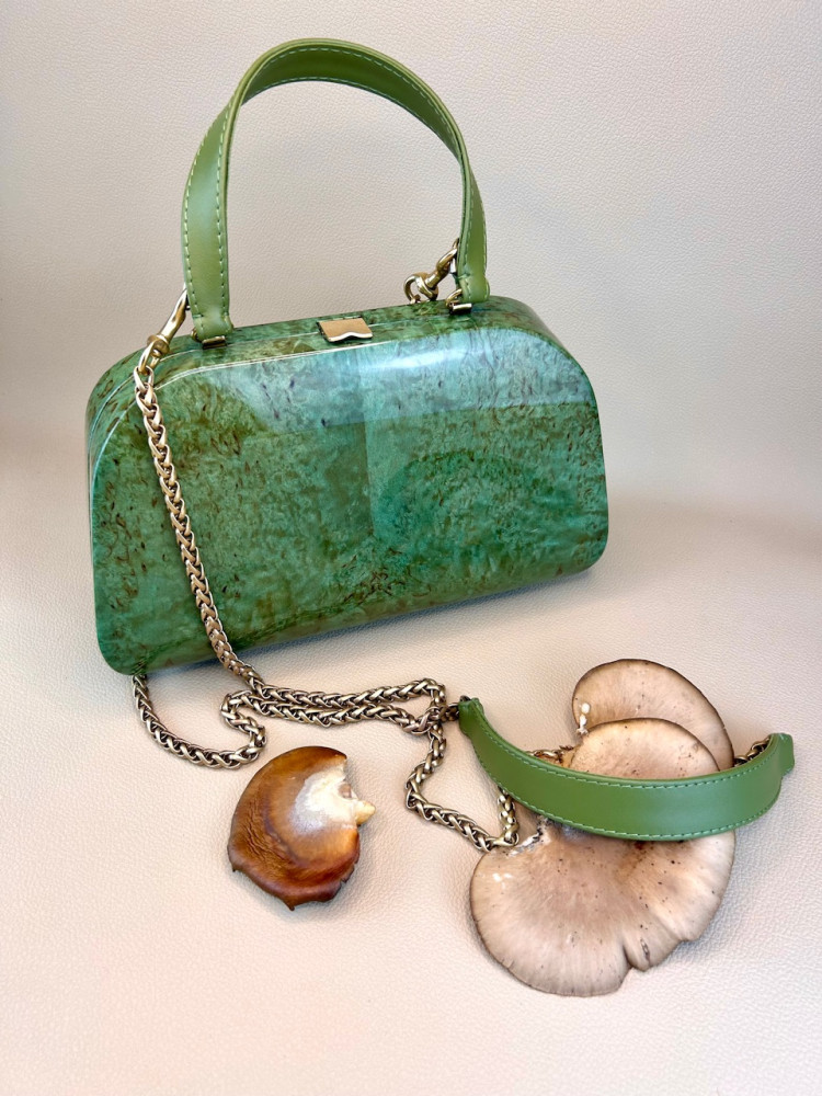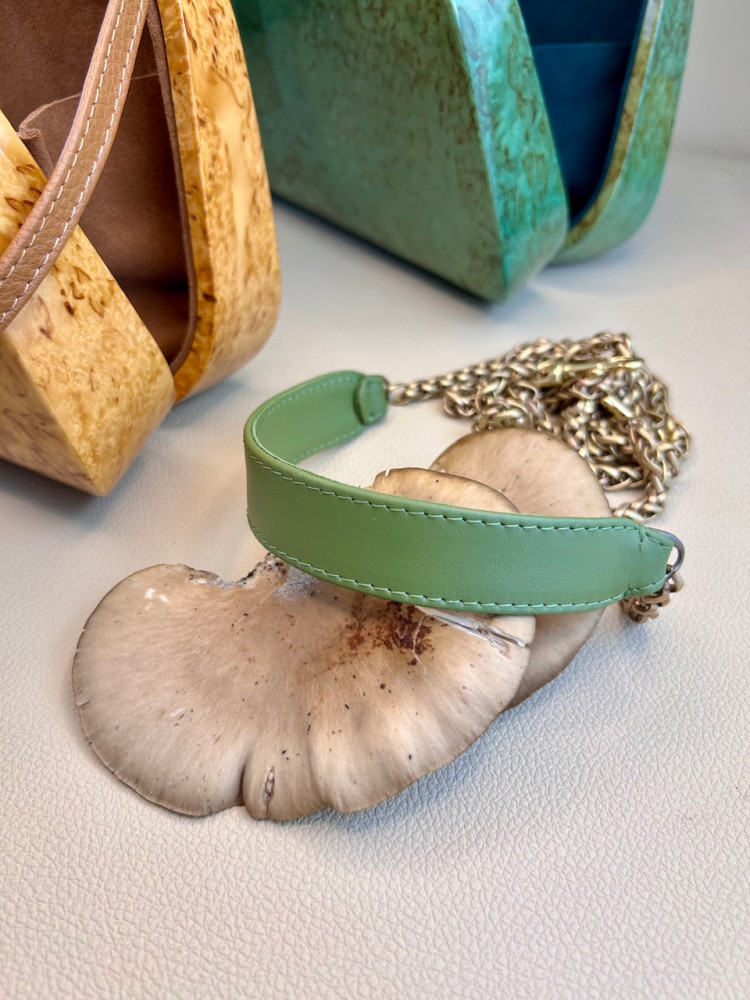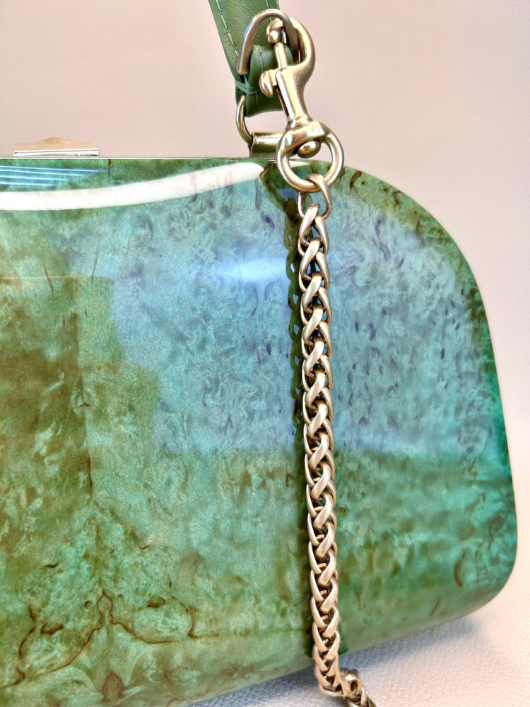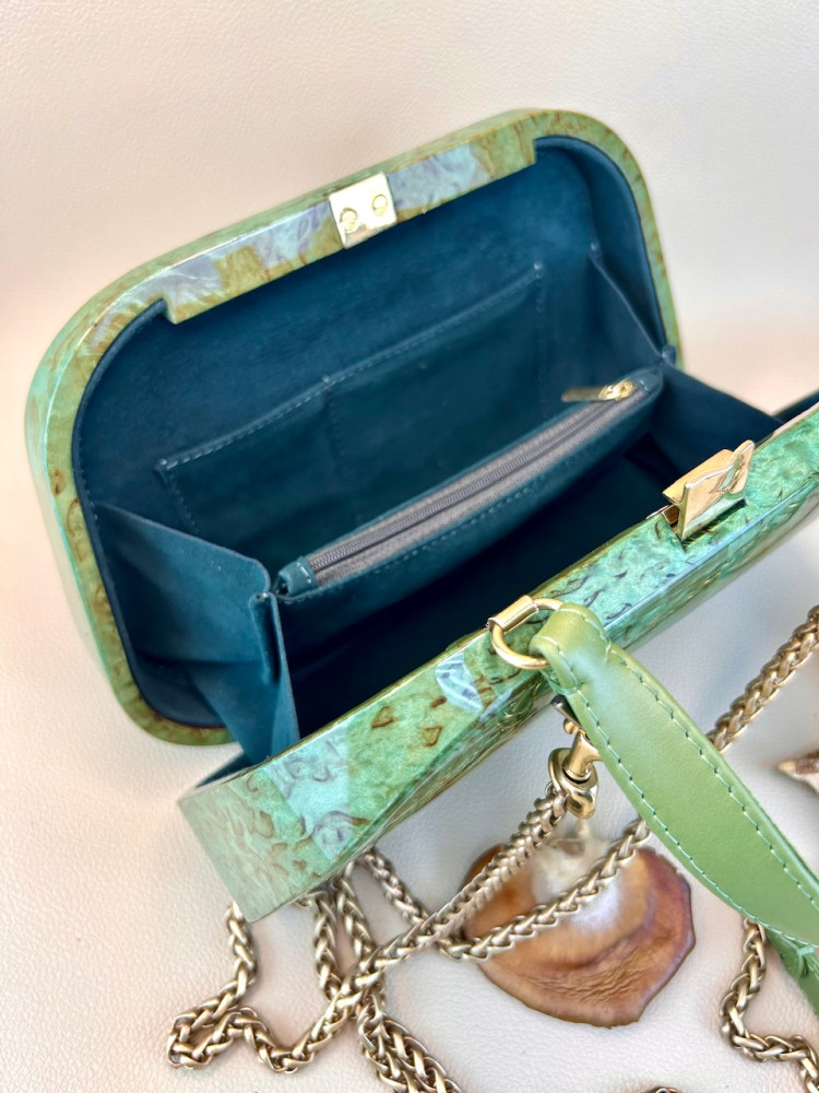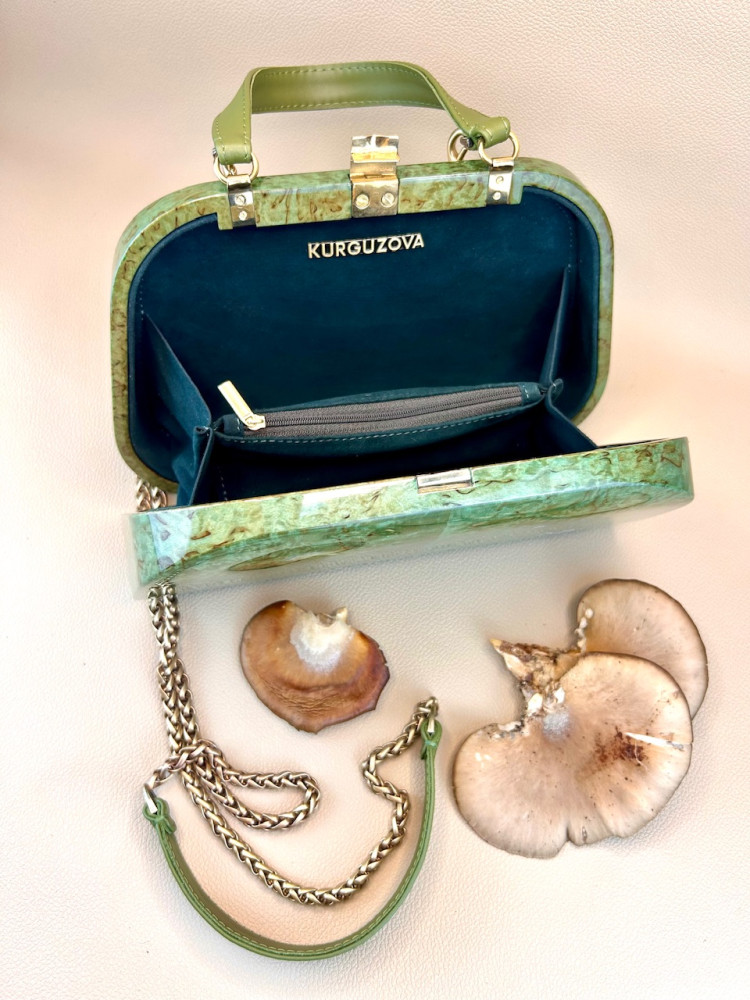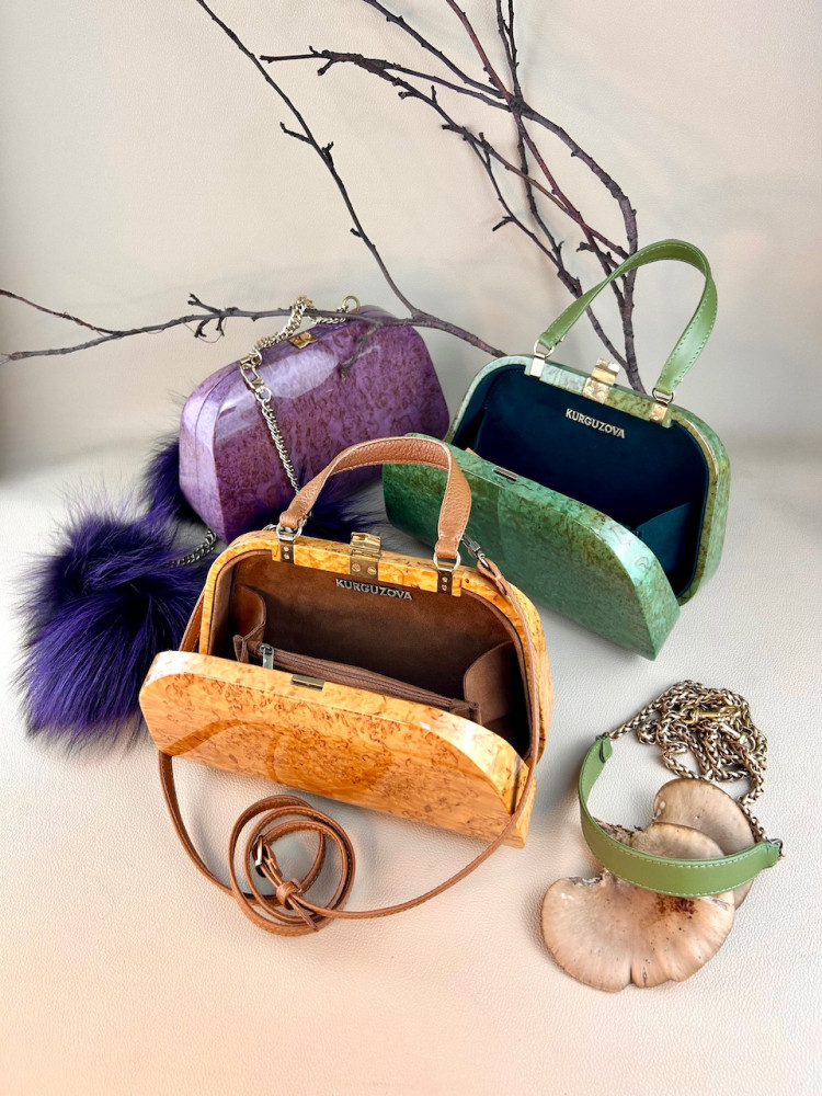 Материал сумки: натуральная карельская береза, тонированная в зеленоватый теплый оттенок, лакированная.