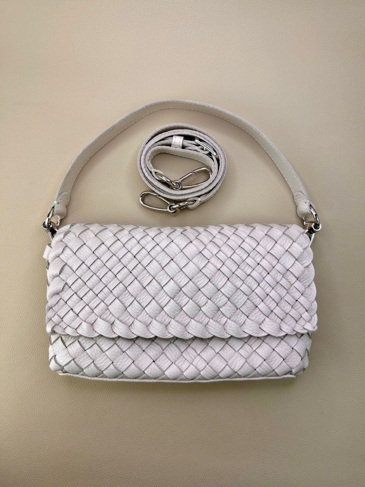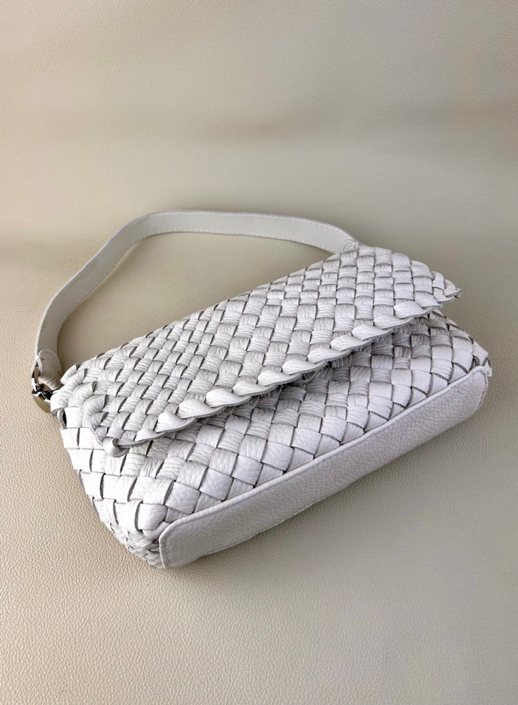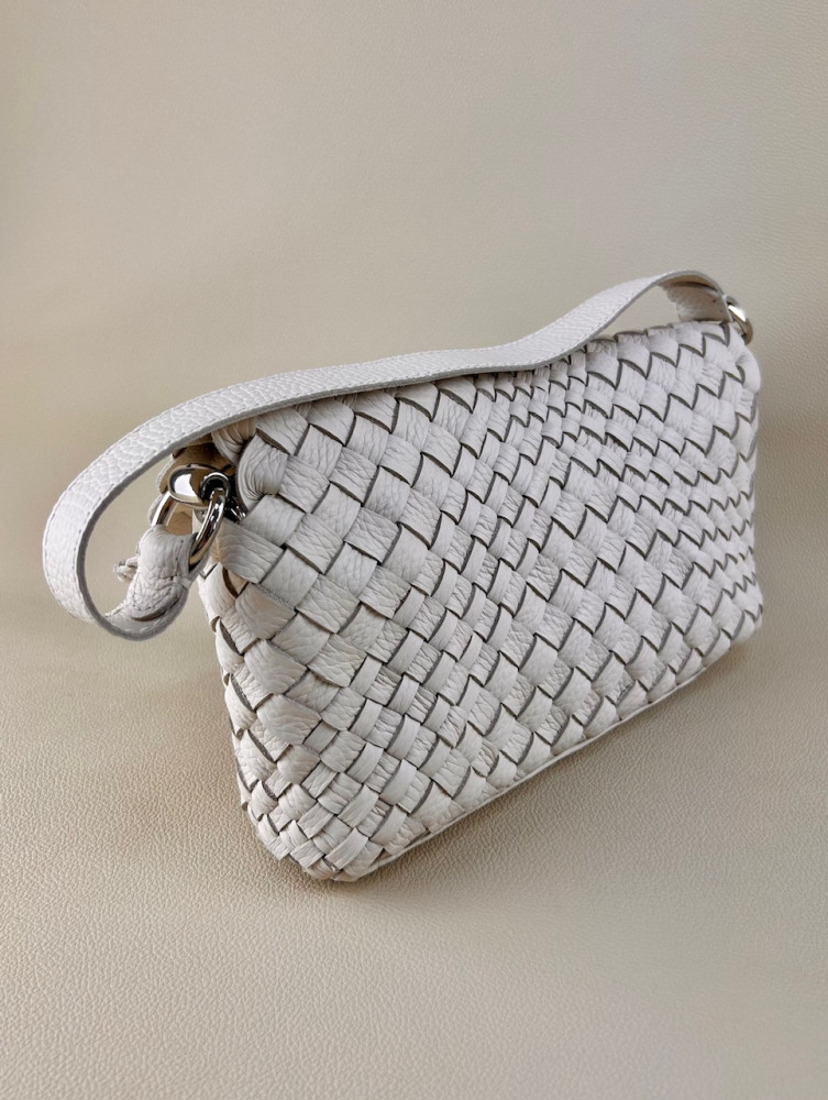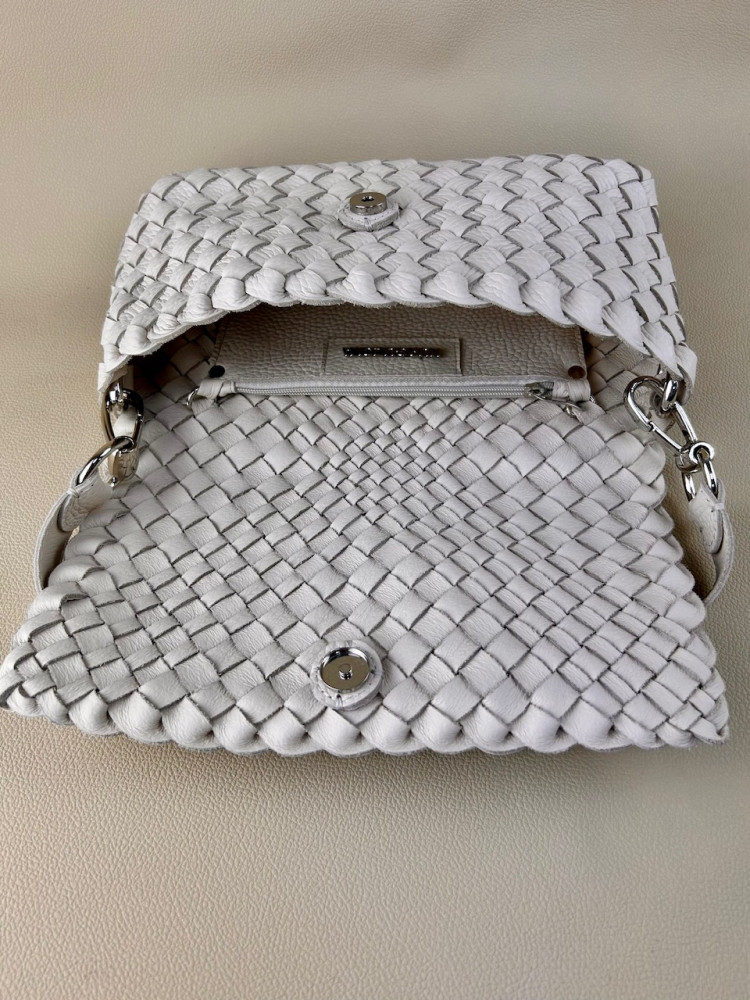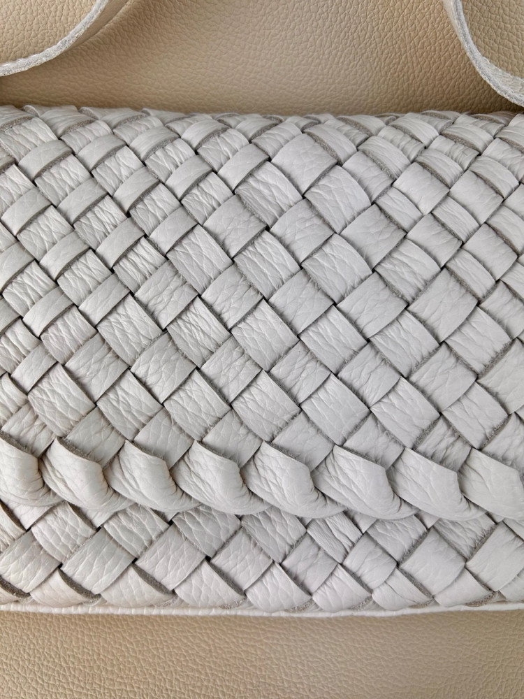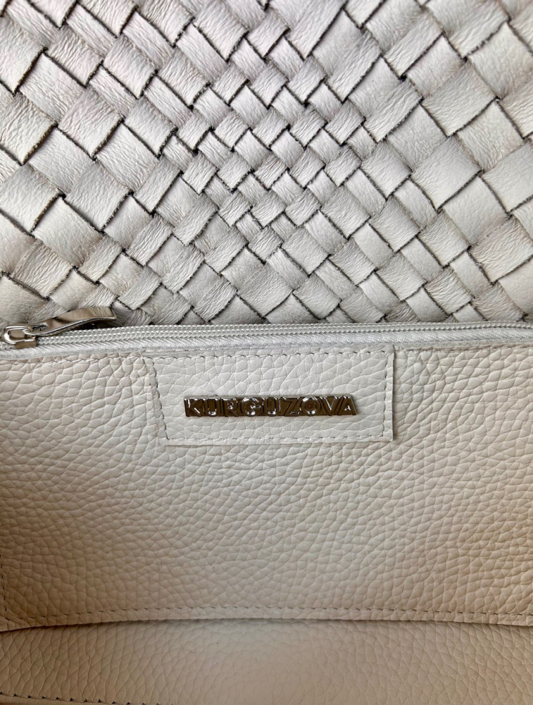 Клатч плетеный Emma из натуральной мягкой итальянской кожи в светлом сливочном оттенке. Модель выполнена в технике плетения Intrecciato (интречиато). Плетение выполнено полностью вручную на нашем собственном производстве в Санкт-Петербурге. На этой модели используются полосы разной ширины, это создает еще более богатую фактуру.
