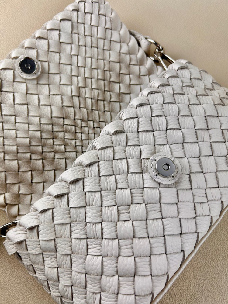 Особенность «intrecciato» заключается в переплетении тонких кожаных лент, которые образуют ромбовый узор. Таким образом, подобная техника придает прочность изделиям без потери гибкости. В этом изделии использована двухстороняя кожа, это значит с обратной стороны, внутри сумки вы не увидите бахтормы. Внутри - сумка выглядит так-же аккуратно и привлекательно, как и снаружи.