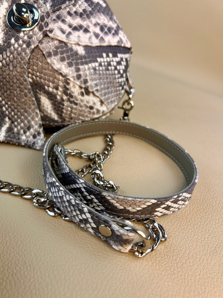 Длинный съемный ремень 120 см. Частично ремешок выполнен из кожи питона ( обычно от 20 до 50 см, в зависимости от длины шкуры), остальная часть выполнена в виде цепочки.