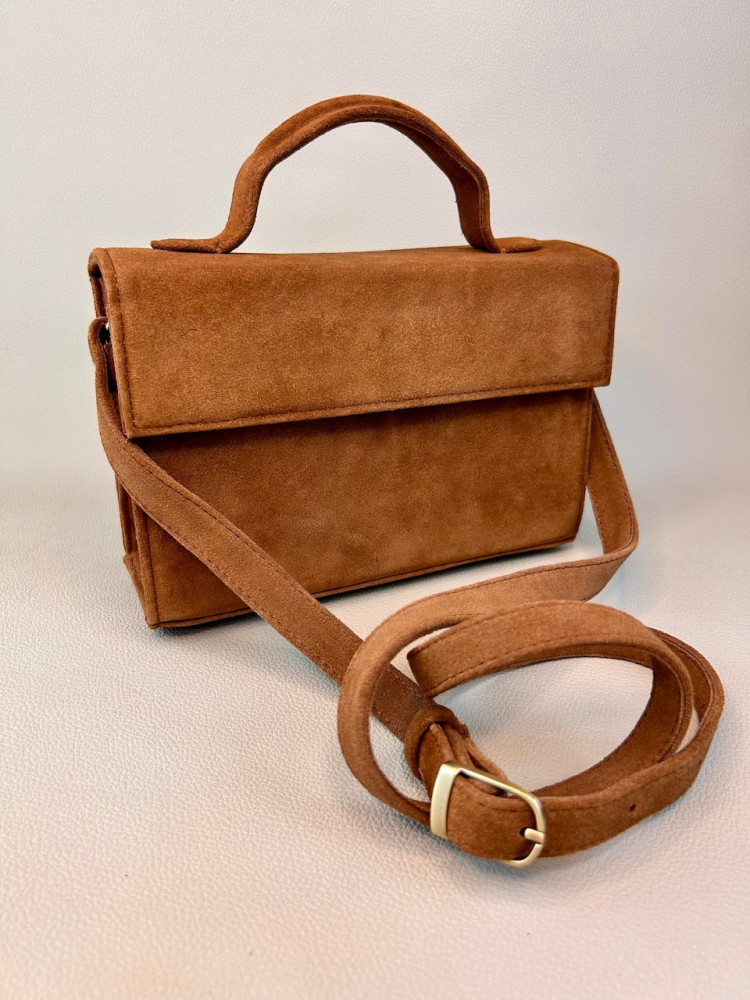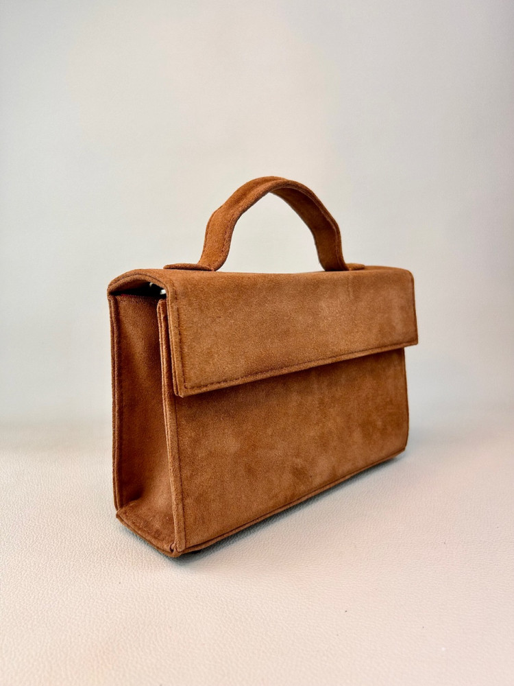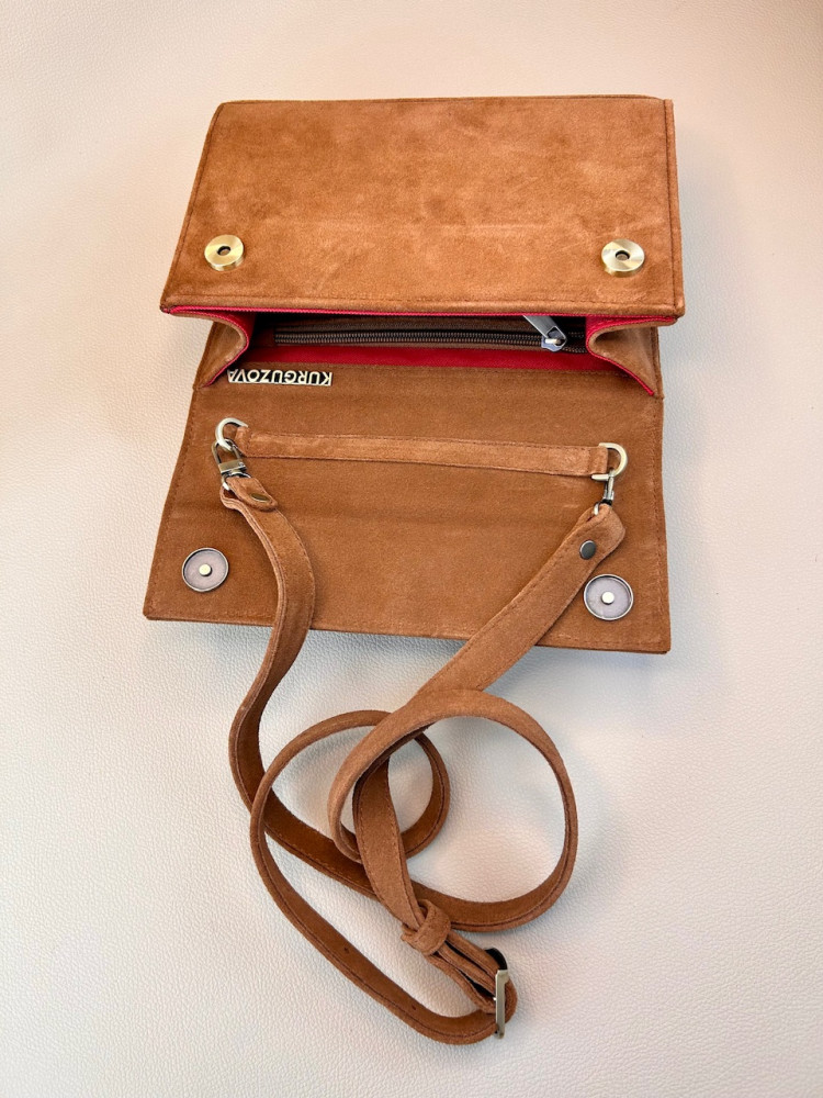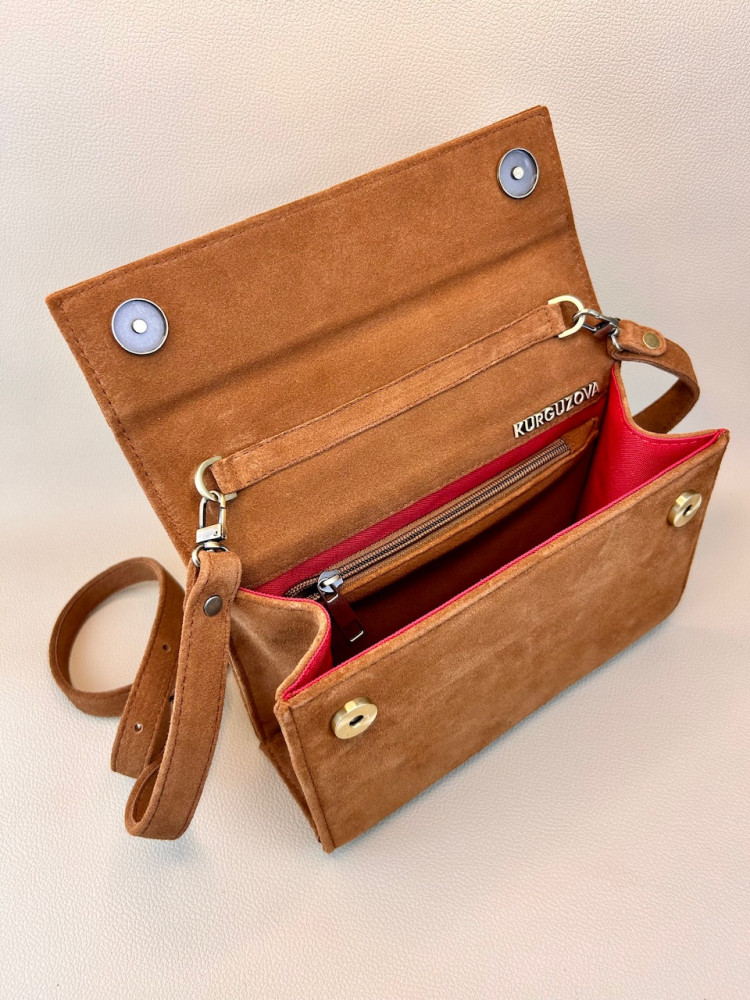 Небольшая сумка через плечо. Трендовая форма сумочки - удобно и актуально. Натуральная мягкая замша карамельного оттенка - тактильно приятная.
