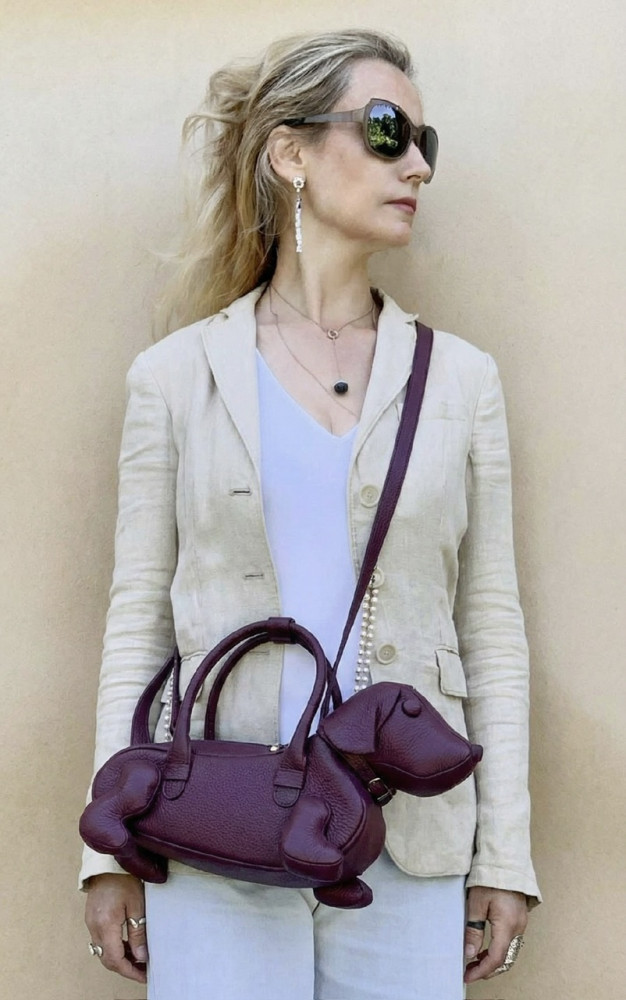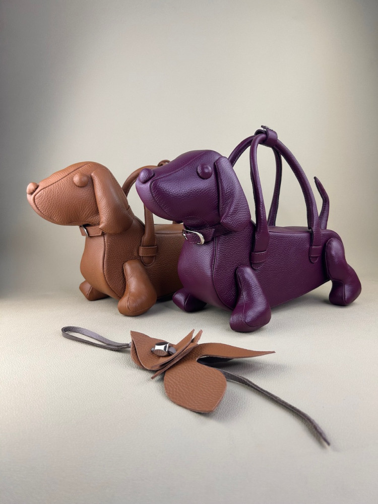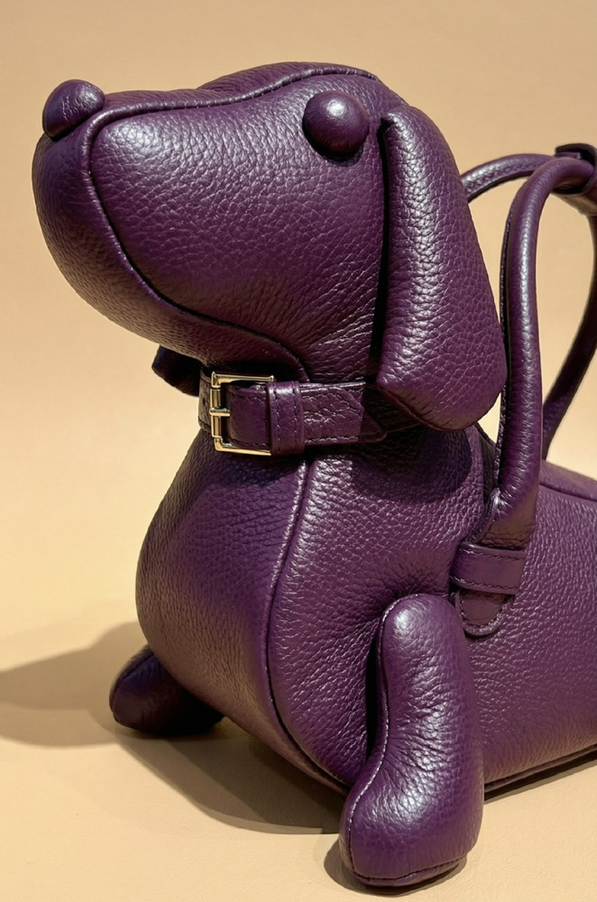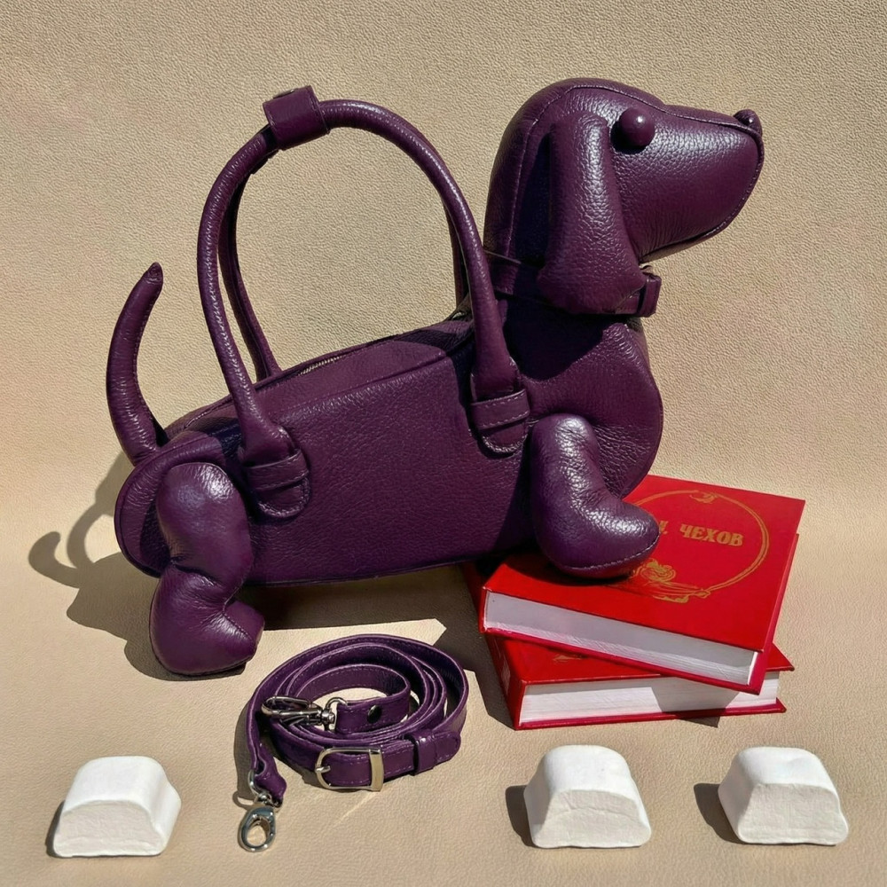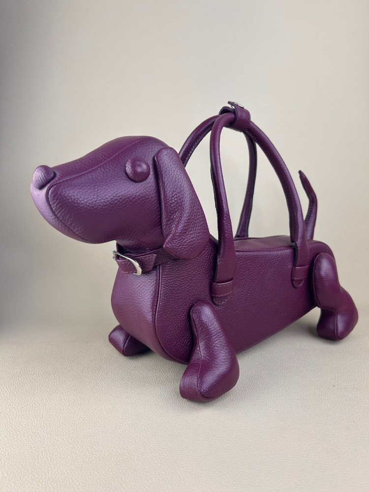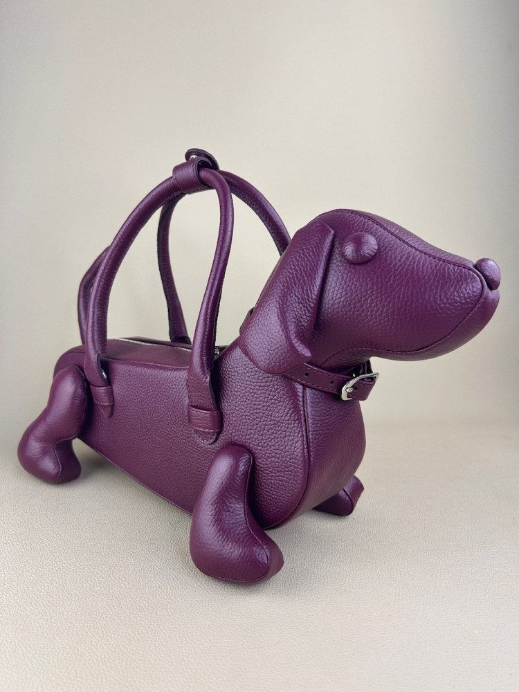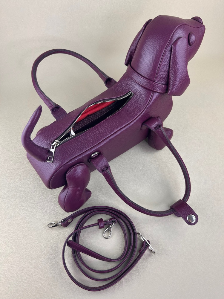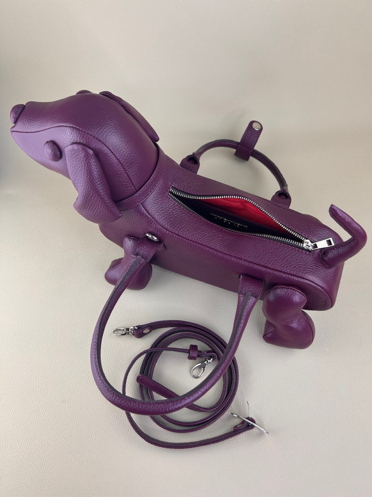 Сумка оснащена внутренними карманами. Мягкая зернистая кожа сложного оттенка, это смесь бордового переходящего в фиолетовый. Как густой осадок в красном вине. Цвет при этом остается насыщенным. Нос и глаза собаки также выполнены из натуральной кожи. Идеально подойдет для повседневного использования, а также будет прекрасным аксессуаром для яркого образа.