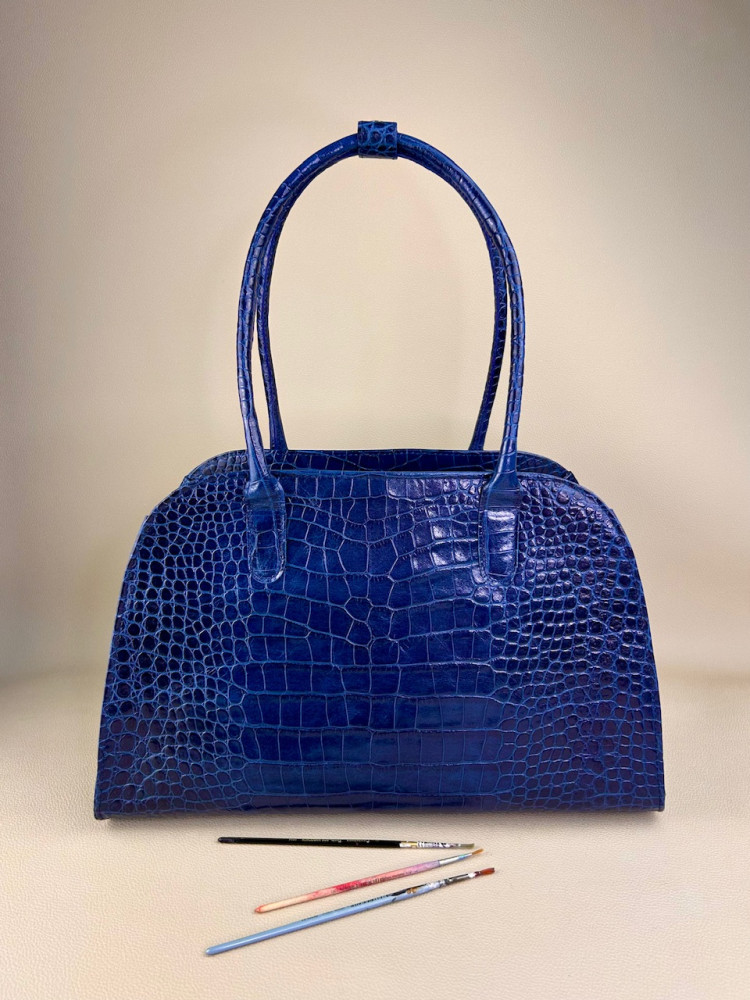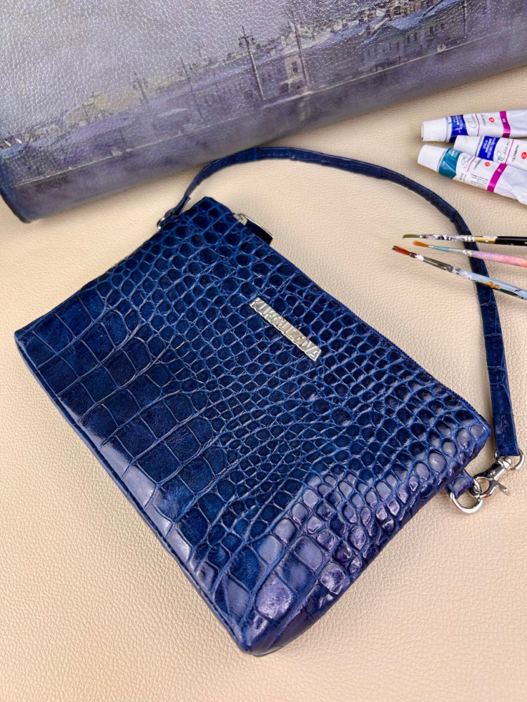 Материал: синяя телячья натуральная кожа с фактурой крокодила. Лицевая сторона выполнена из зернистой телячьей кожи.
