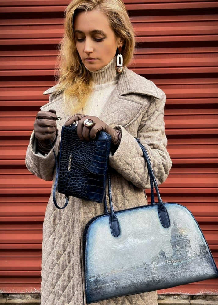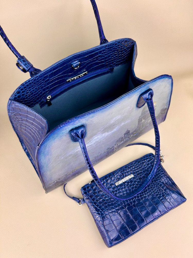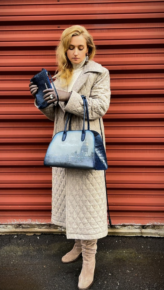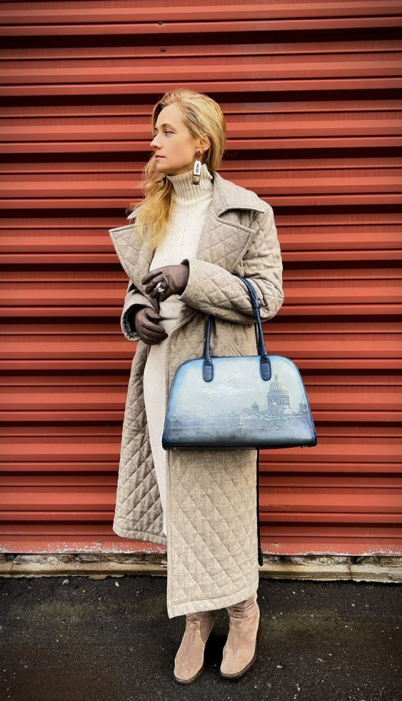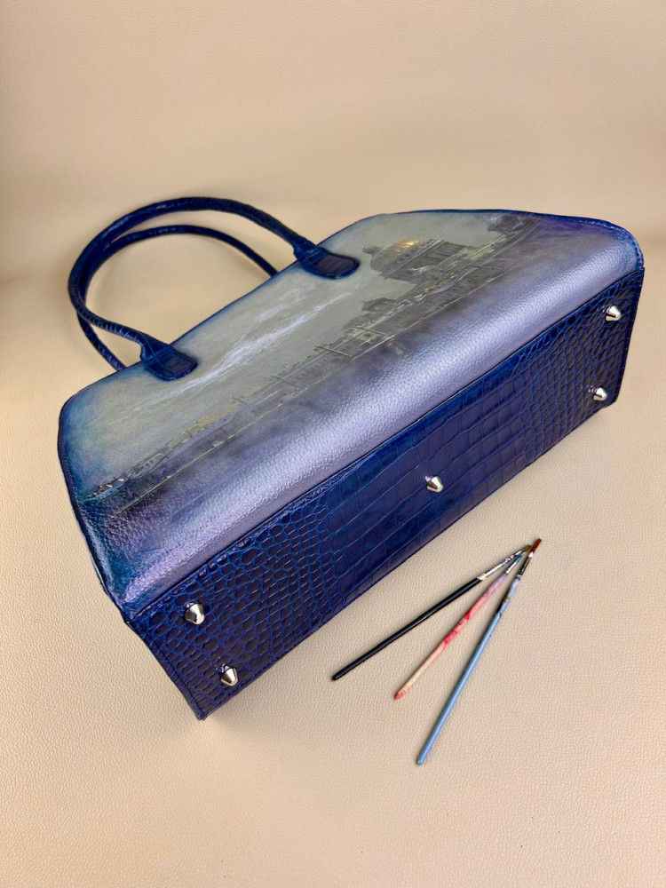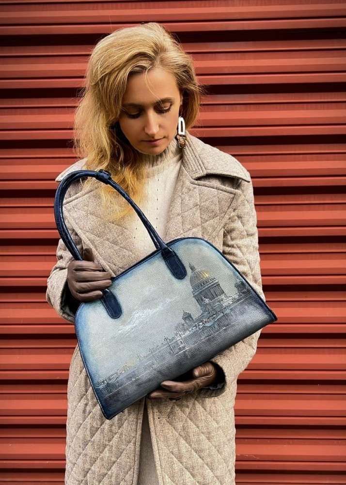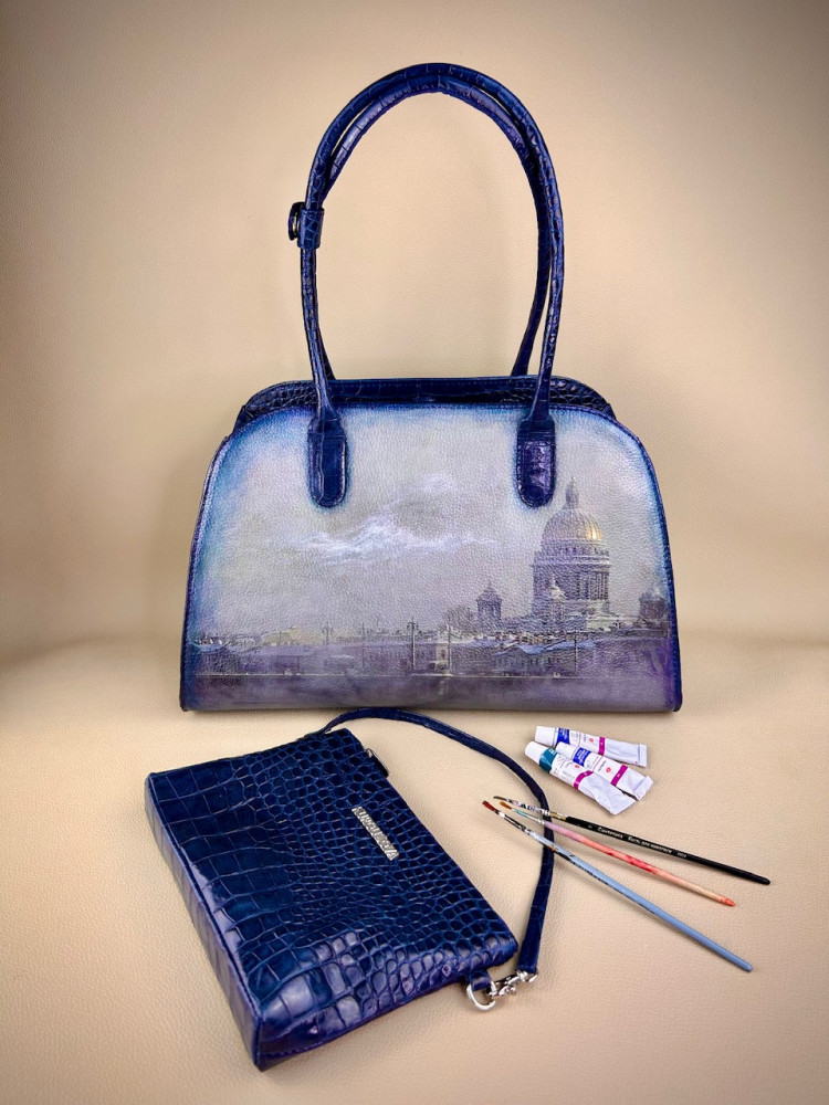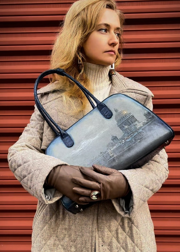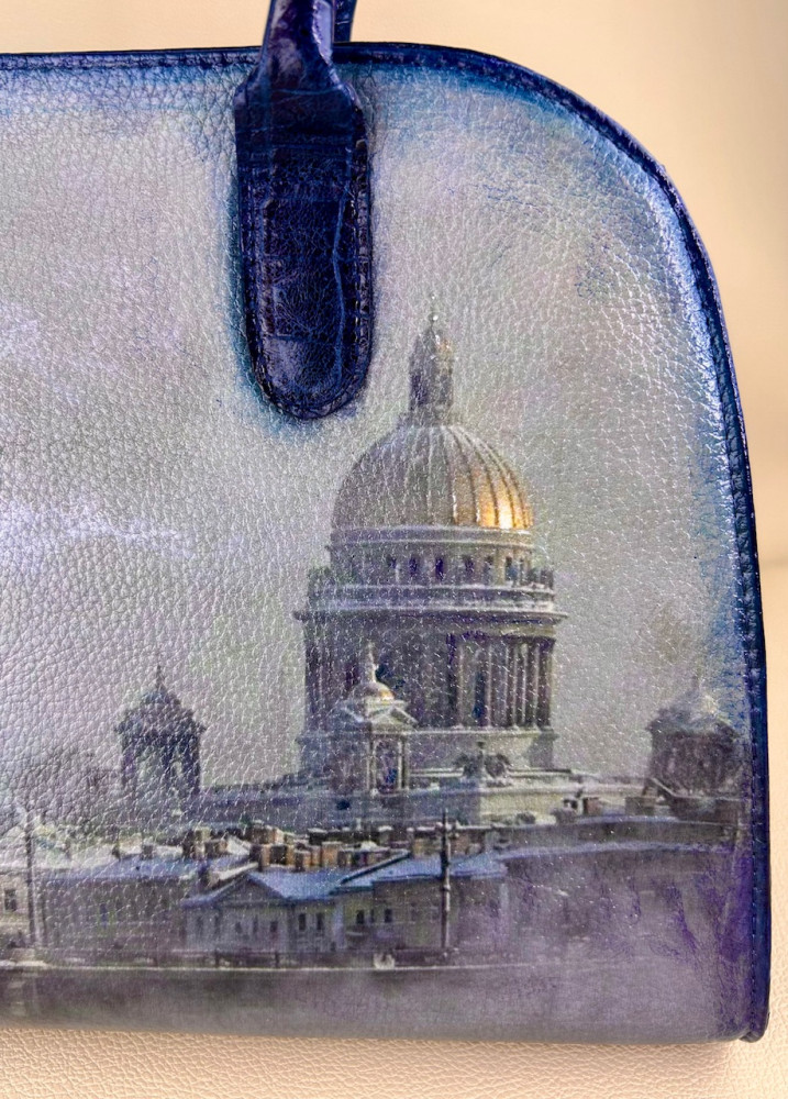Изюминкой этой модели стало изображение Исаакиевского собора и вид на Санкт-Петербург. Это изображение выполнено на натуральной коже. Первым этапом нанесения рисунка - стал принт, вторым этапом – ручная роспись по коже. Мы затонировали края принта, выделили центральные основные акценты композиции и тем самым рисунок приобрёл индивидуальный характер и неповторимость.